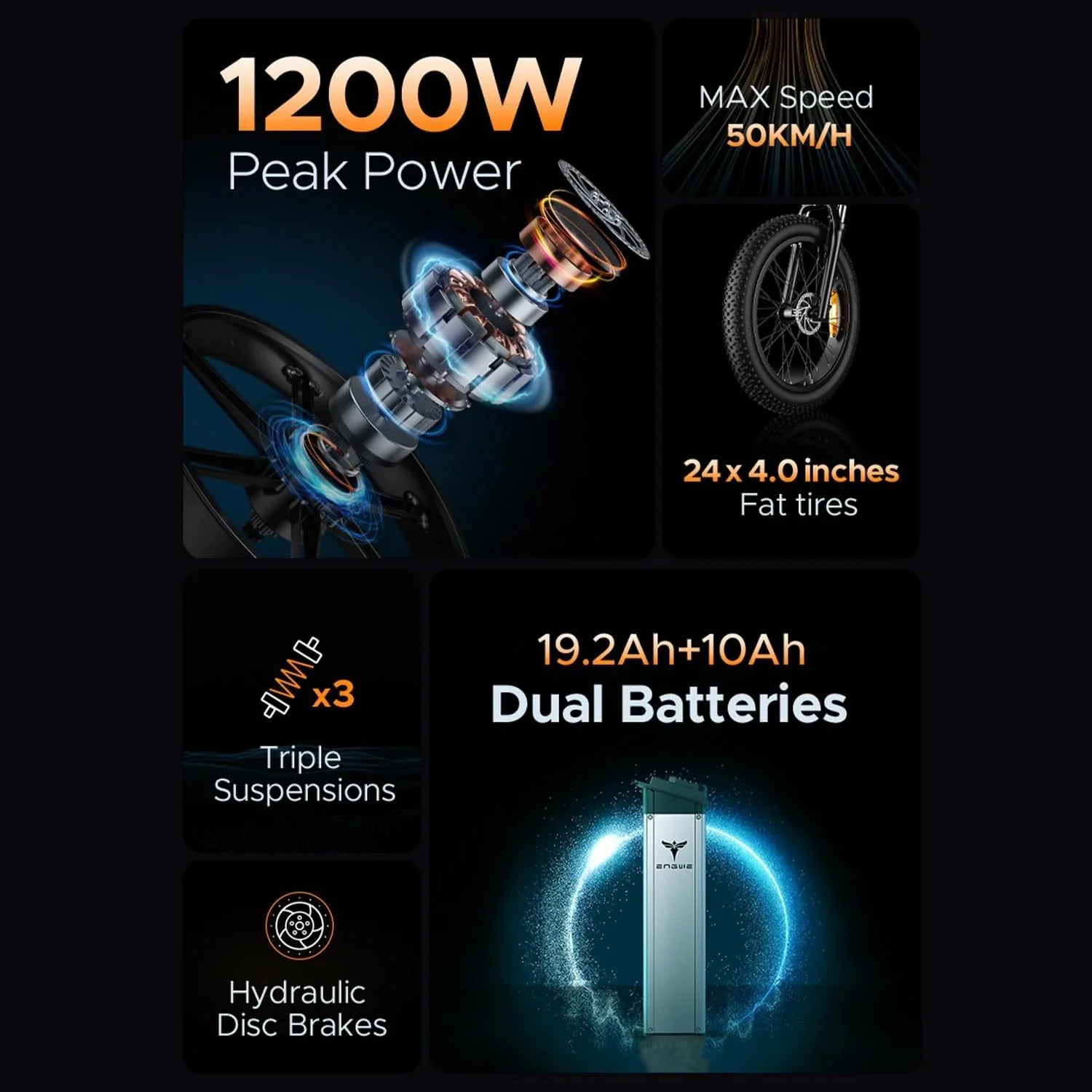 Experience the power and unstoppable speed of the ENGWE electric bike X24, an impressive Electric mountain bike with a top speed of 31 mph and a mind-blowing maximum power of 1200W.